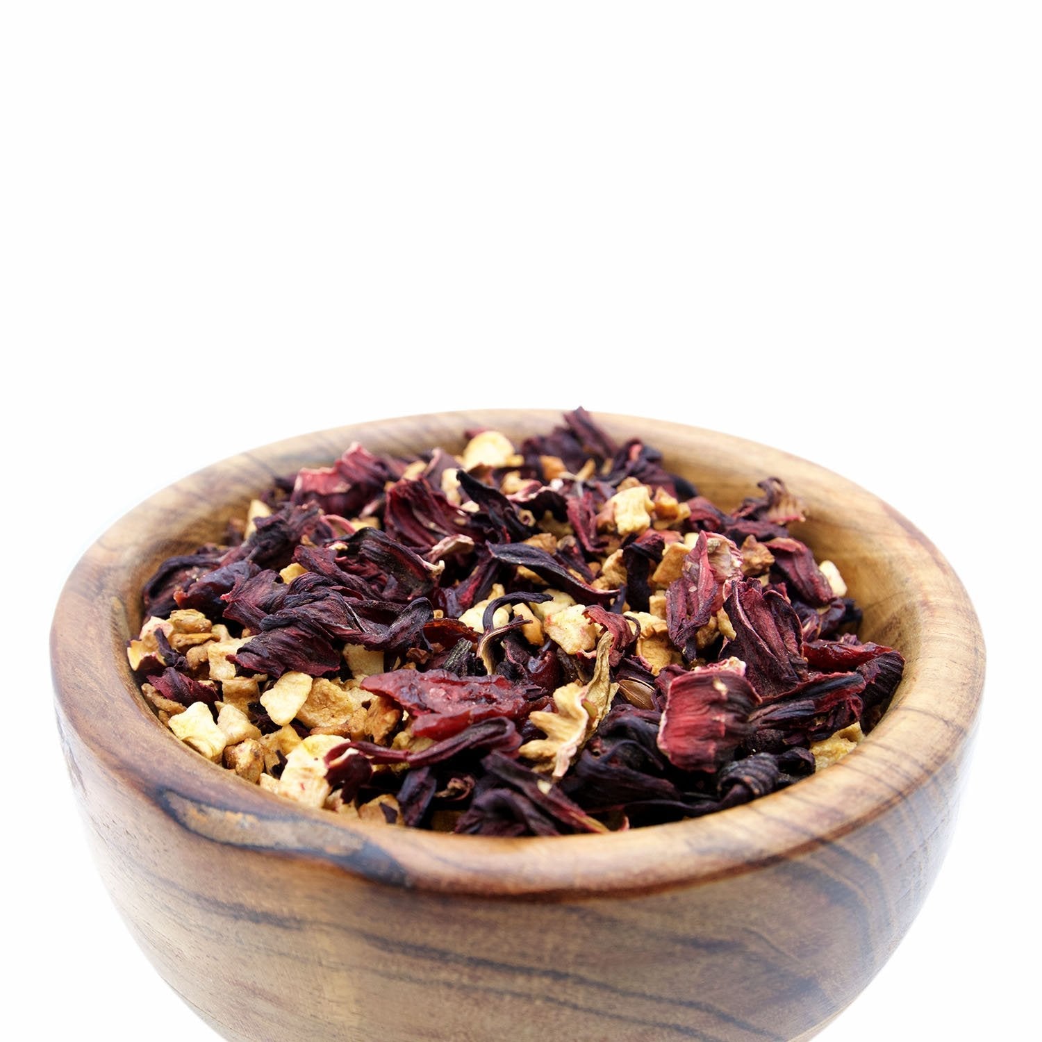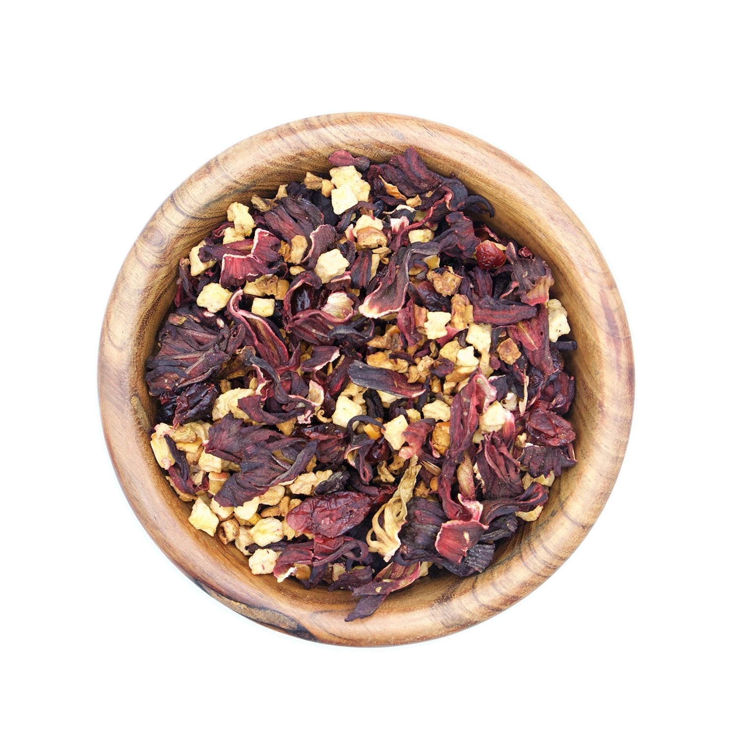 Zmes kvetov ibišteka, sušených kúskov jabĺk, brusníc (brusnice, cukor a rastlinný olej) a aróm.