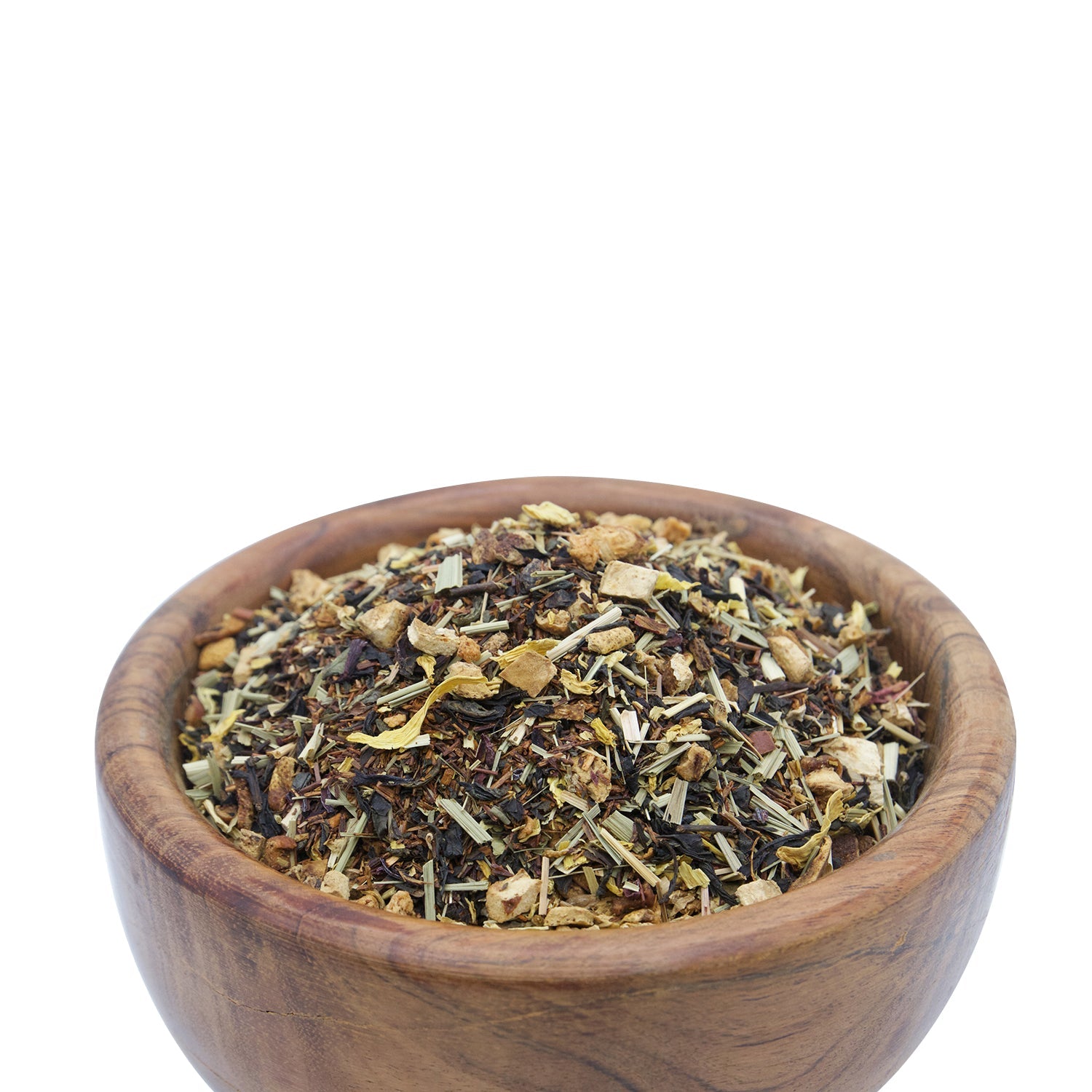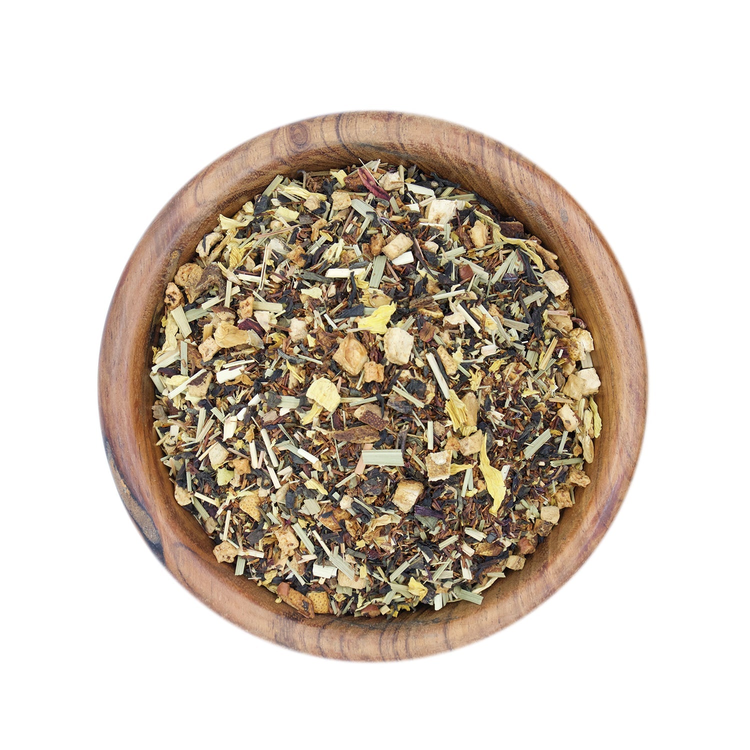 Nádherná zmes rooibosu, zeleného a čierneho čaju s osviežujúcou citrónovou arómou. Obsahuje ibištek, citrónovú trávu, sušené citrónové kôry, okvetné lístky slnečnice a akáciu. Ideálna voľba, ako si ho v lete vychutnať vychladený.